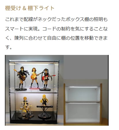 「一番上の棚を照らすトップライト」「展示物を下から照らすフットライト」「ラック棚のダボ穴を利用して照らす棚受けライト」など、多様な使い方が出来ます。
