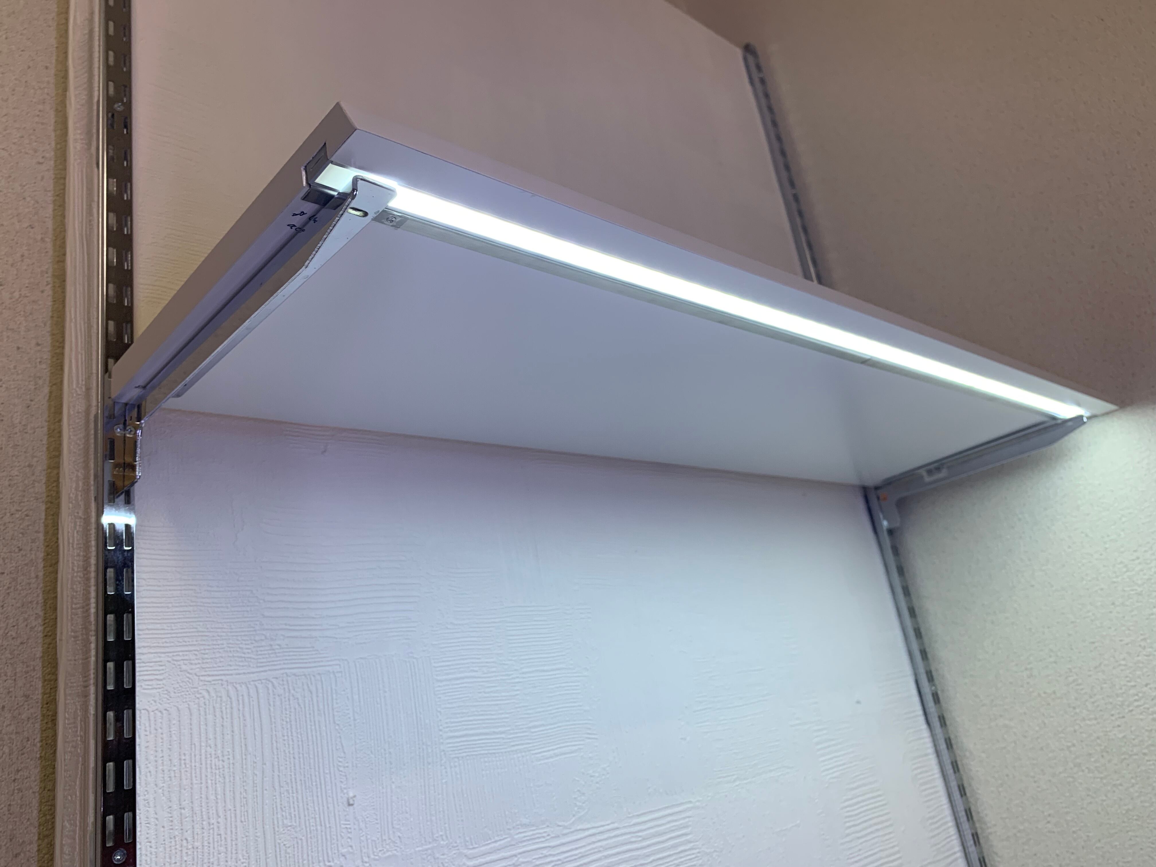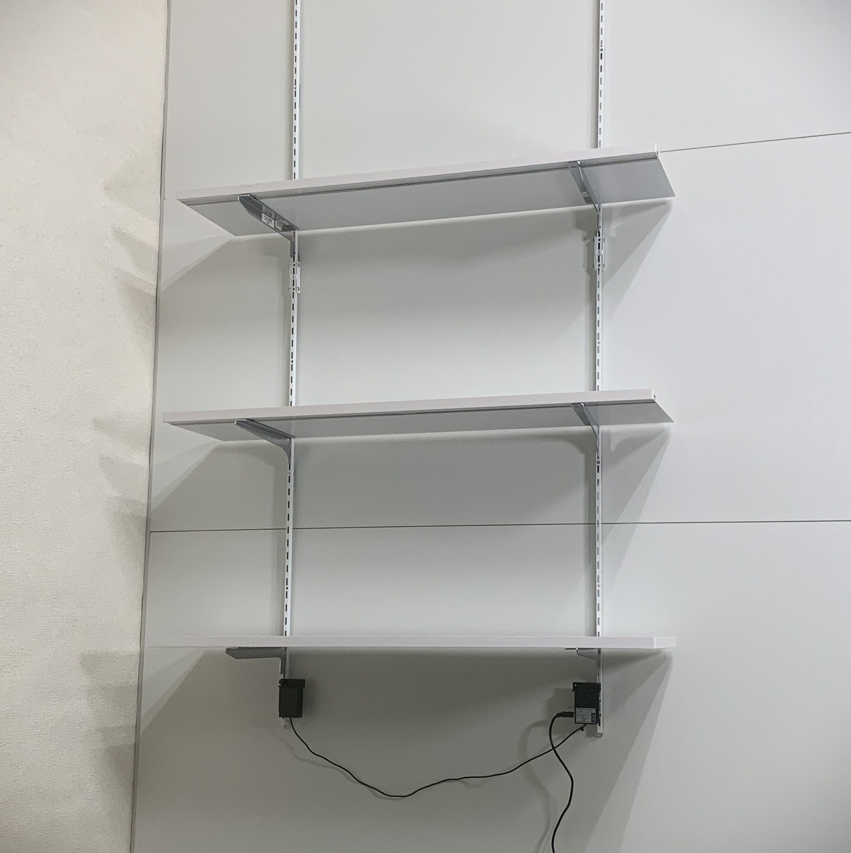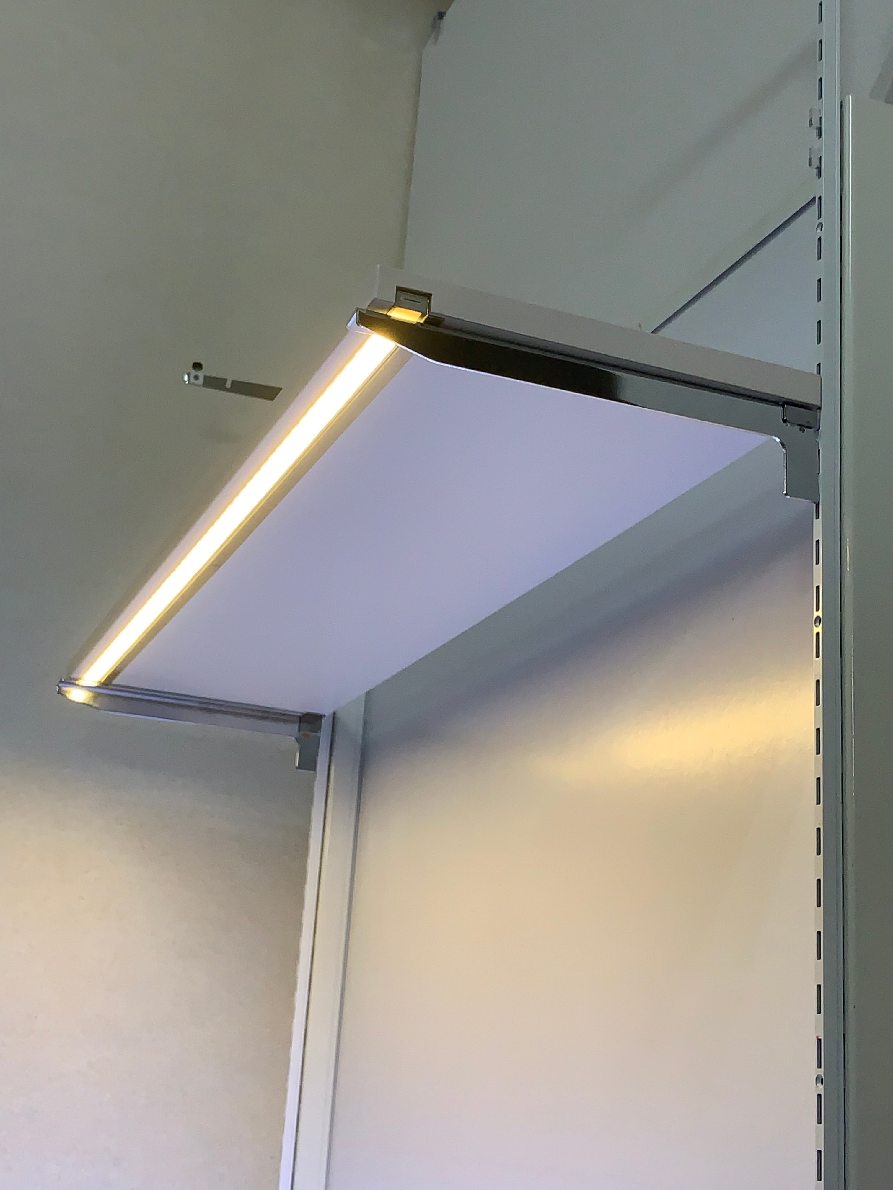 事務所のパーテーションや、展示会のパーテーションに引っ掛けて照明付き棚が作れます。
