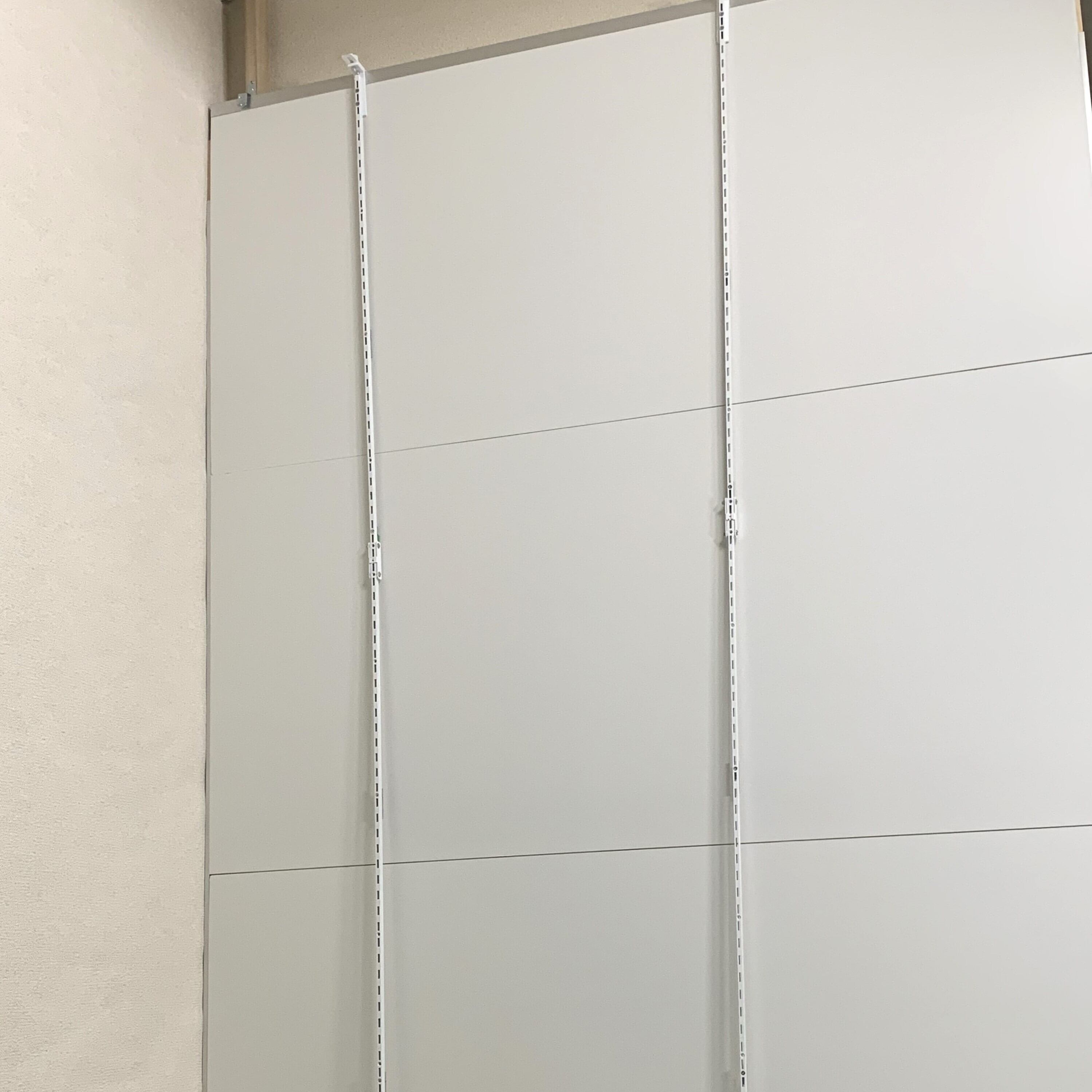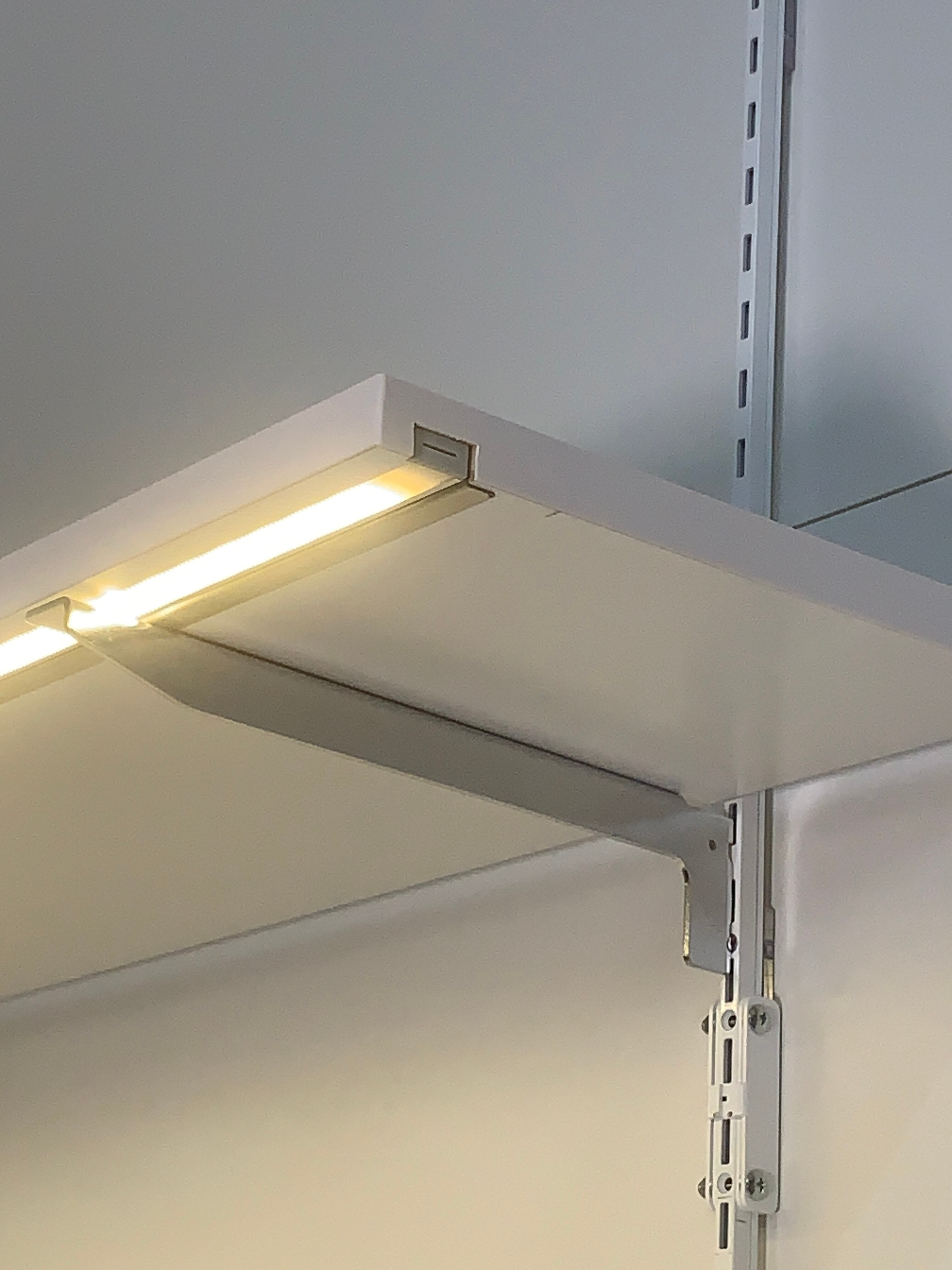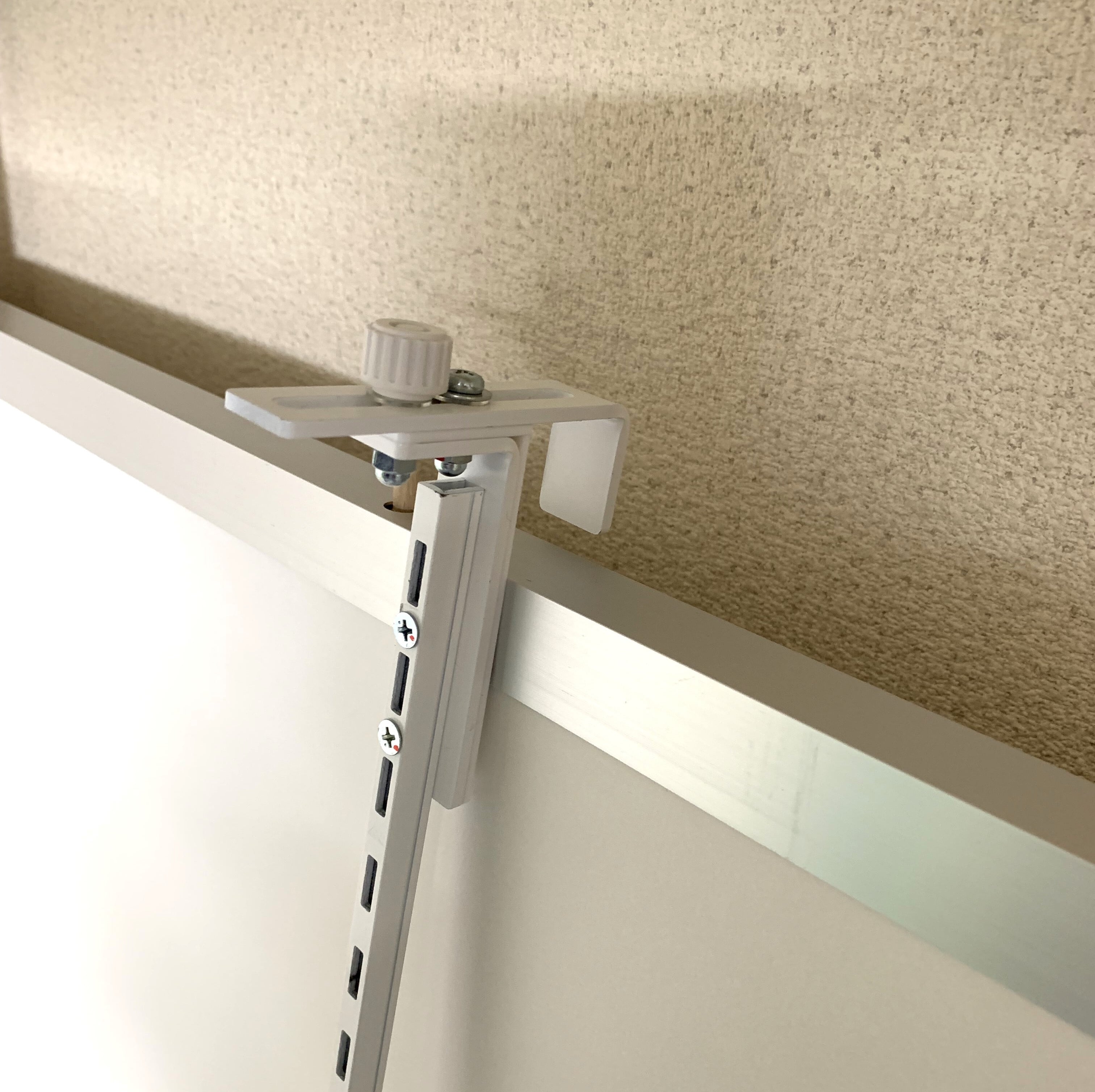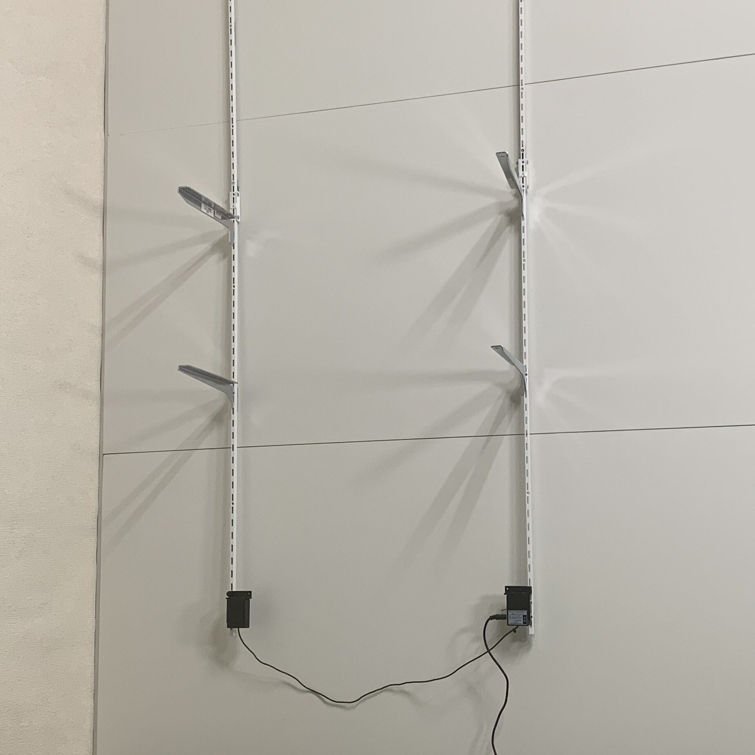 事務所のパーテーションや、展示会のパーテーションに引っ掛けて照明付き棚が作れます。