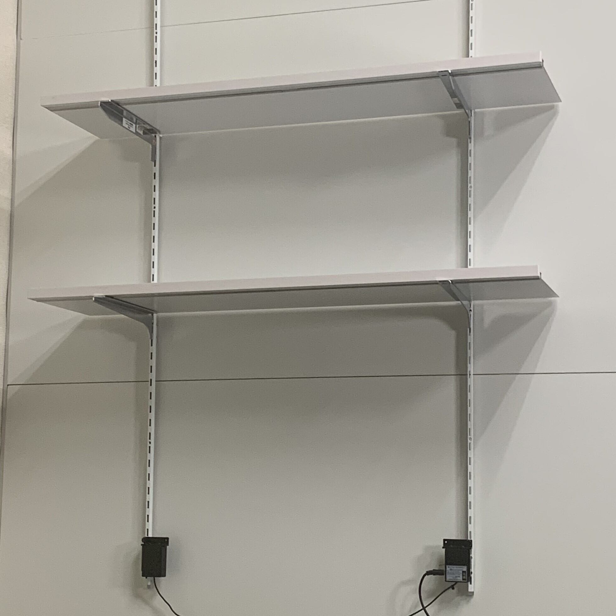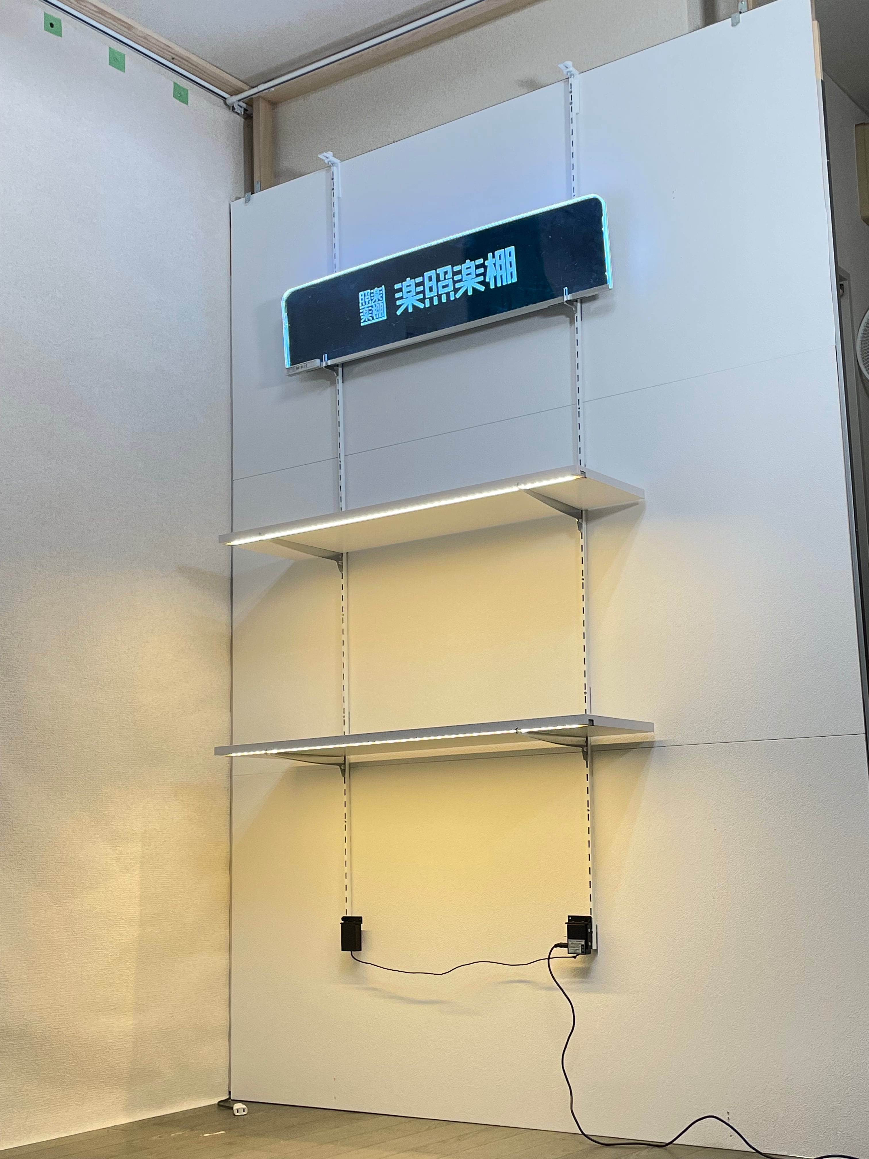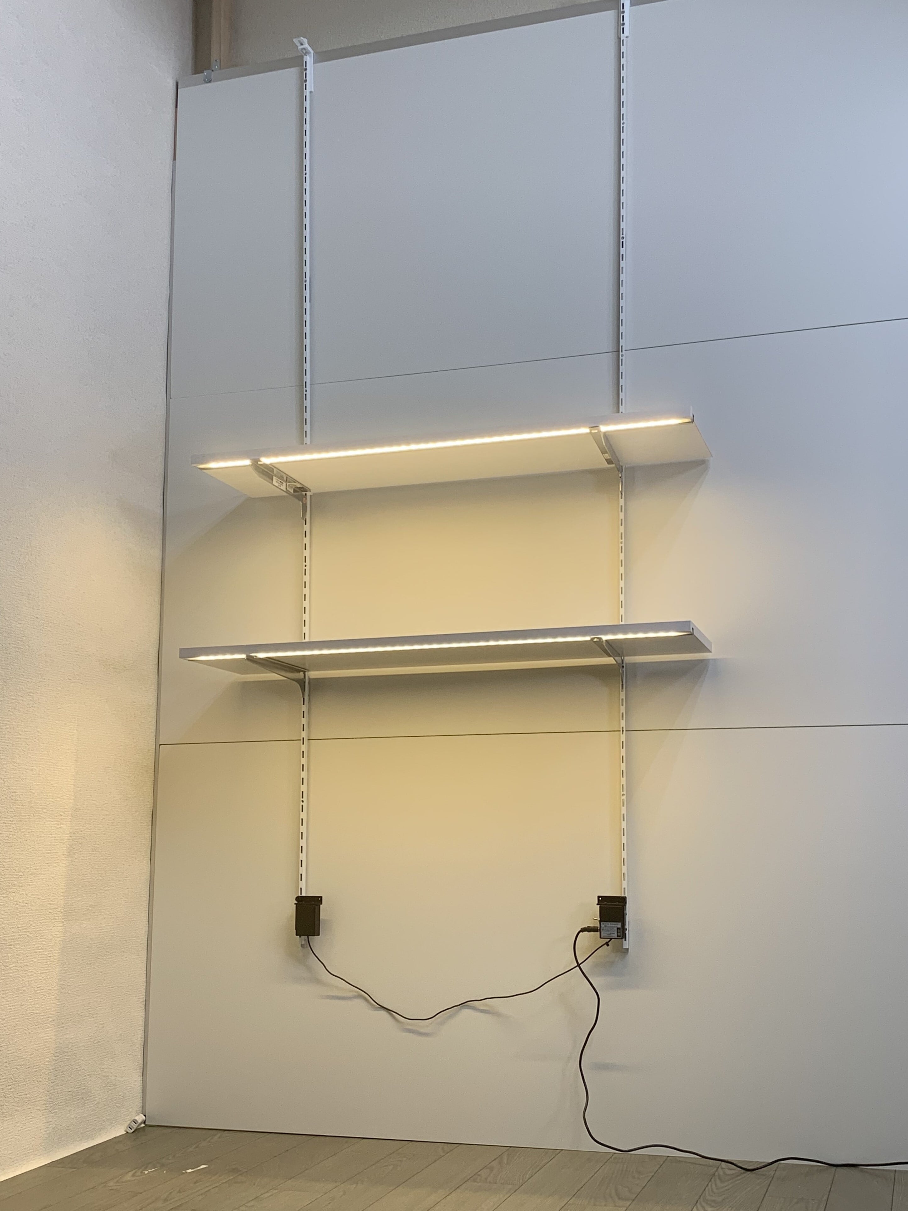 引っ掛け棚柱2本、照明付き棚板2枚、ブラケット4本、電源ユニット、ACアダプター